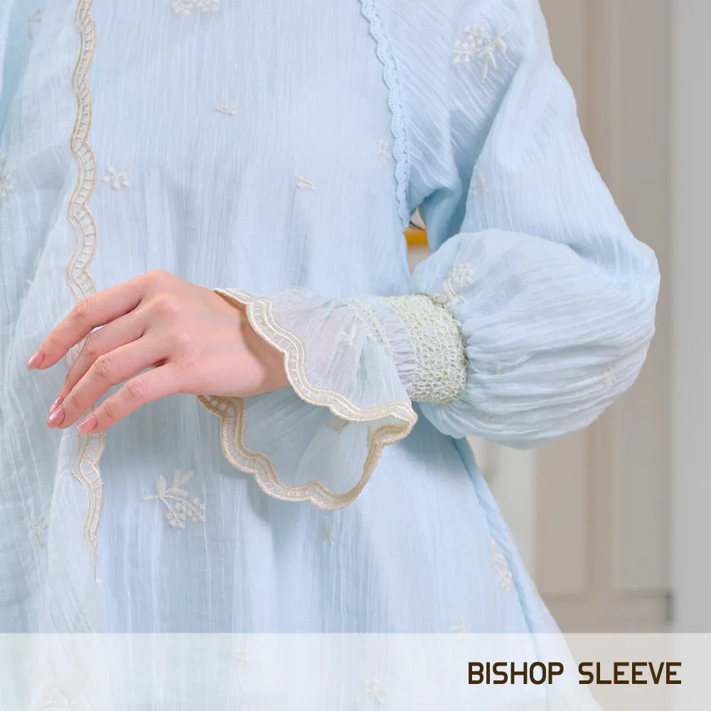 Elegant Silhouette: A Mini Kurung cutting paired with voluminous Bishop sleeves.