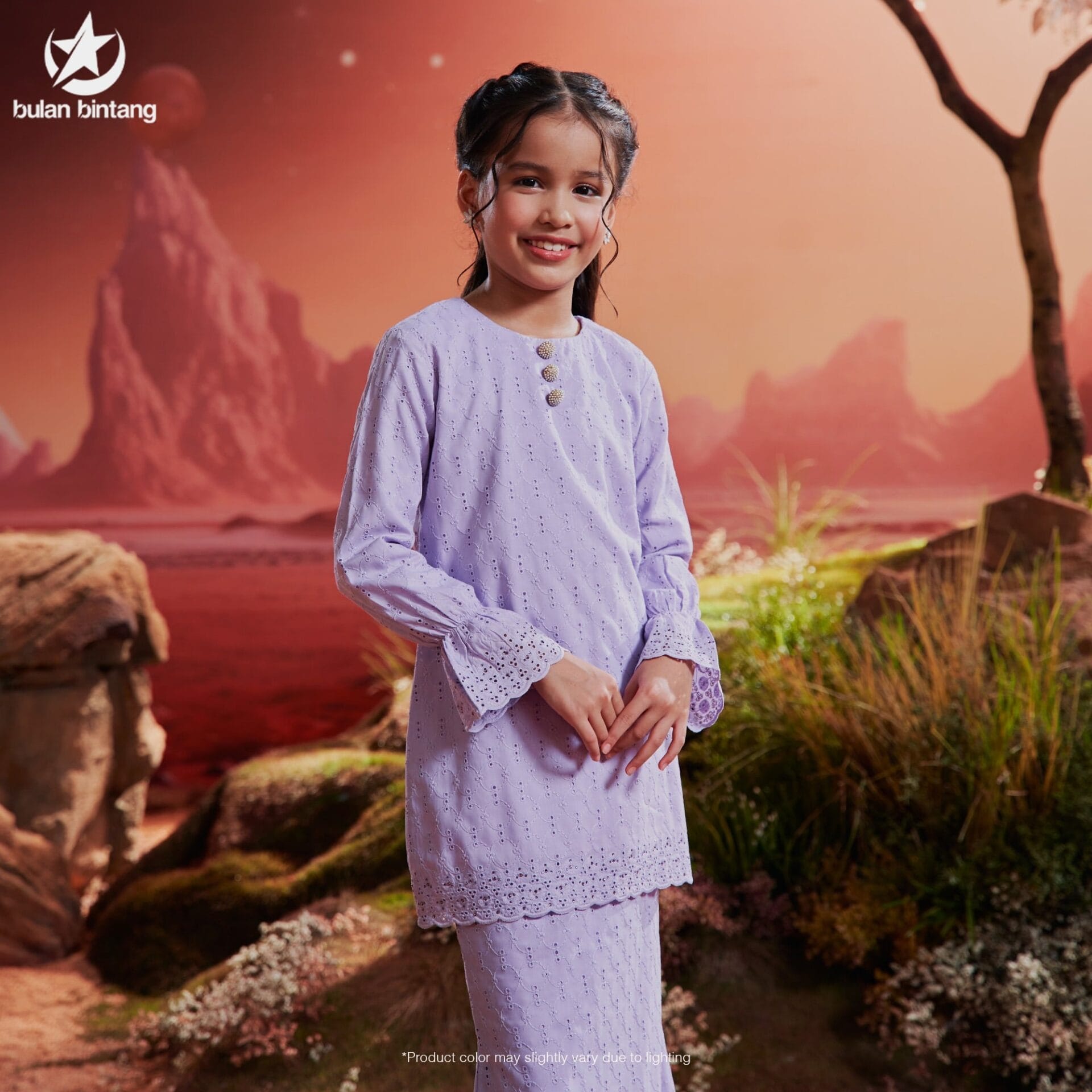 The Baju Kurung from the Bulan Bintang Sisters brand is a traditional Malay attire with a modern twist, combining elegance and contemporary design elements. Here is a detailed description of the top and bottom: