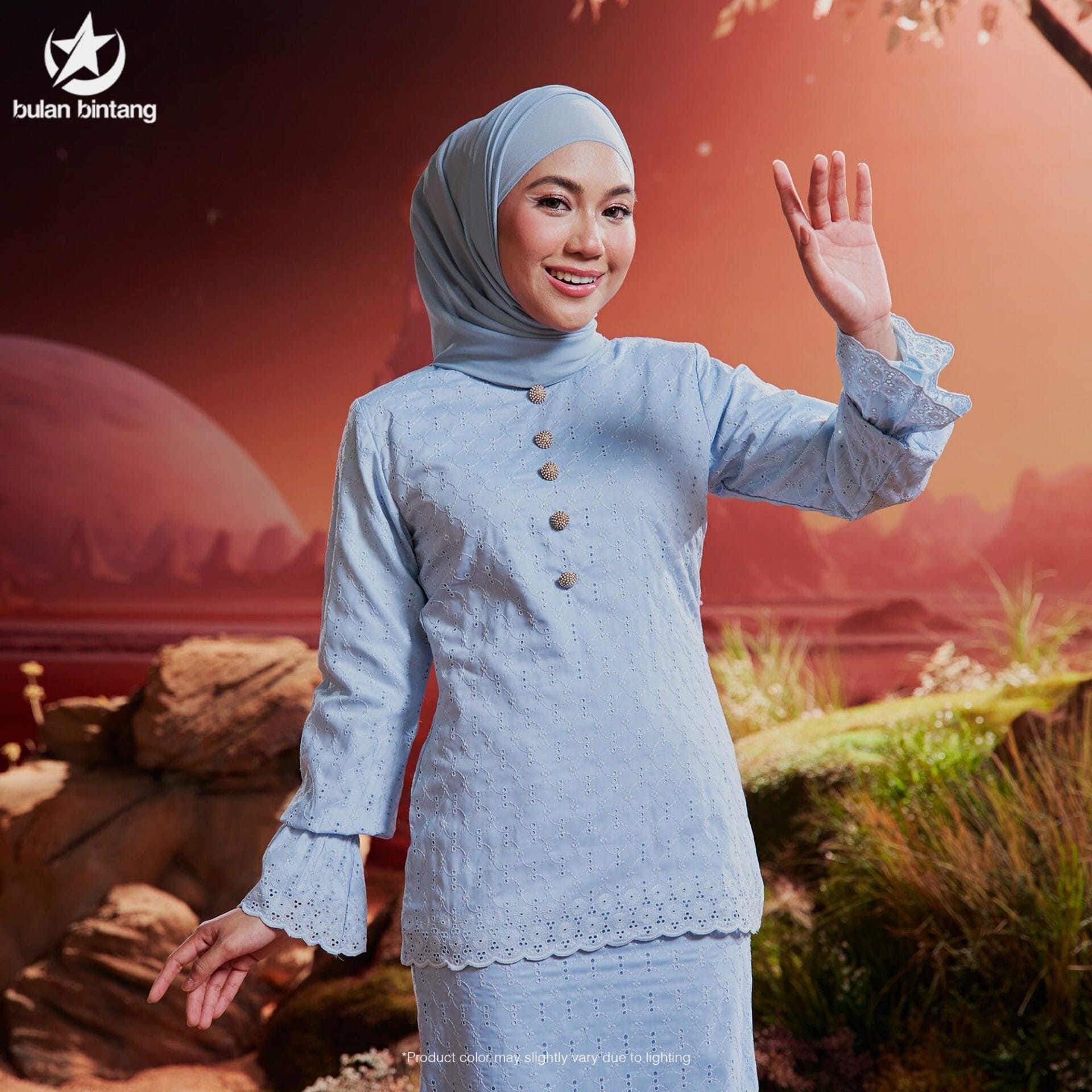 The Baju Kurung from the Bulan Bintang Sisters brand is a traditional Malay attire with a modern twist, combining elegance and contemporary design elements. Here is a detailed description of the top and bottom: