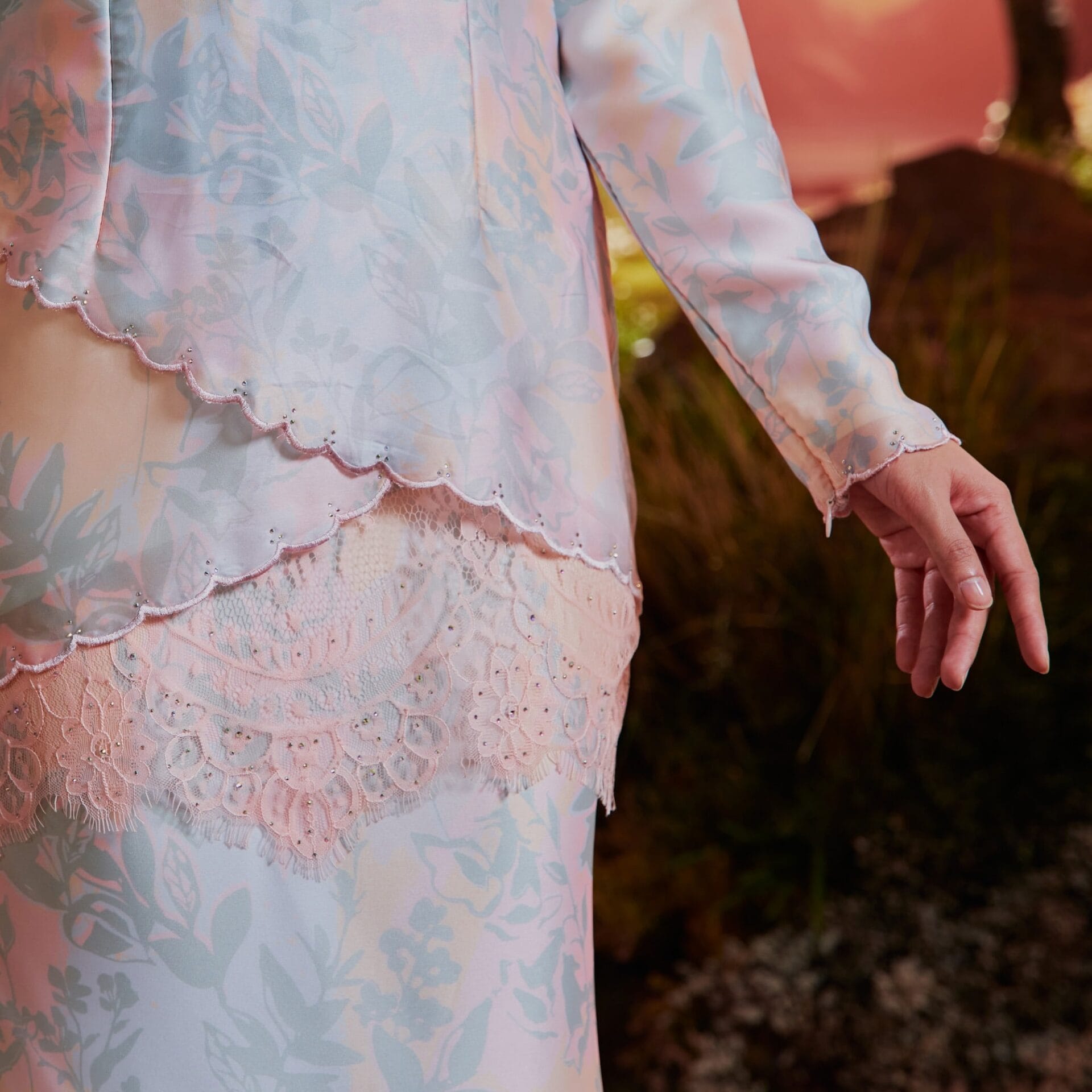 Layered Embroidery with Lace and Hot Fix: Intricately layered embroidery, complemented by lace and hot fix accents, creates a captivating visual texture that captures attention and admiration.
