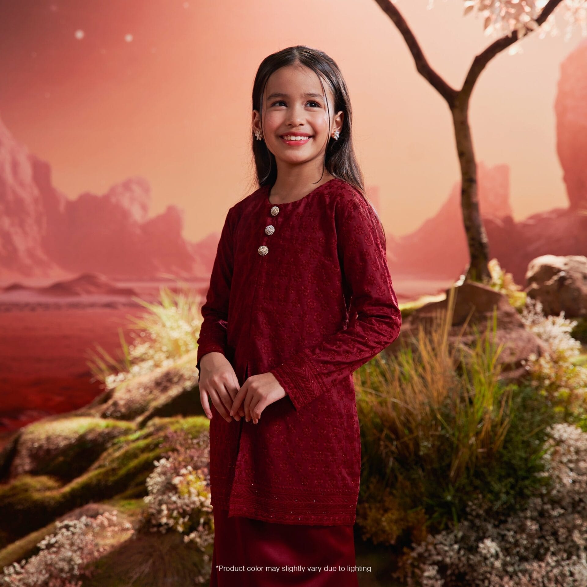 Kurung with Slit at Front: The kurung features a tasteful slit at the front, offering a contemporary twist to traditional design, allowing for ease of movement while exuding modern sophistication.