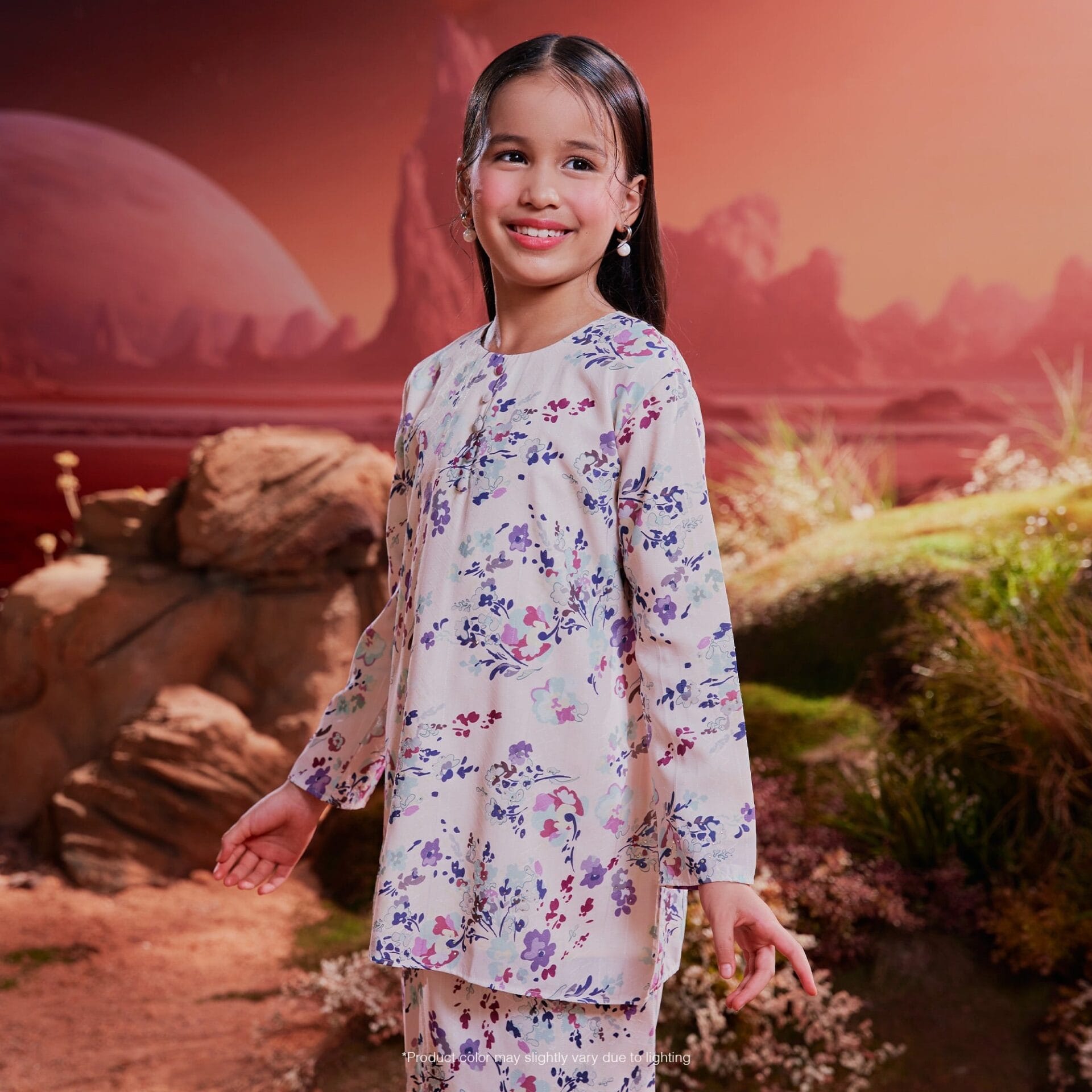 This Baju from Bulan Bintang Sisters combines traditional elements with modern details, offering a unique and stylish ensemble. The V-neckline, hot fix embellishments, front opening with mushroom button, front pleat skirt, and side zipper contribute to a fashionable and versatile outfit suitable for various occasions.