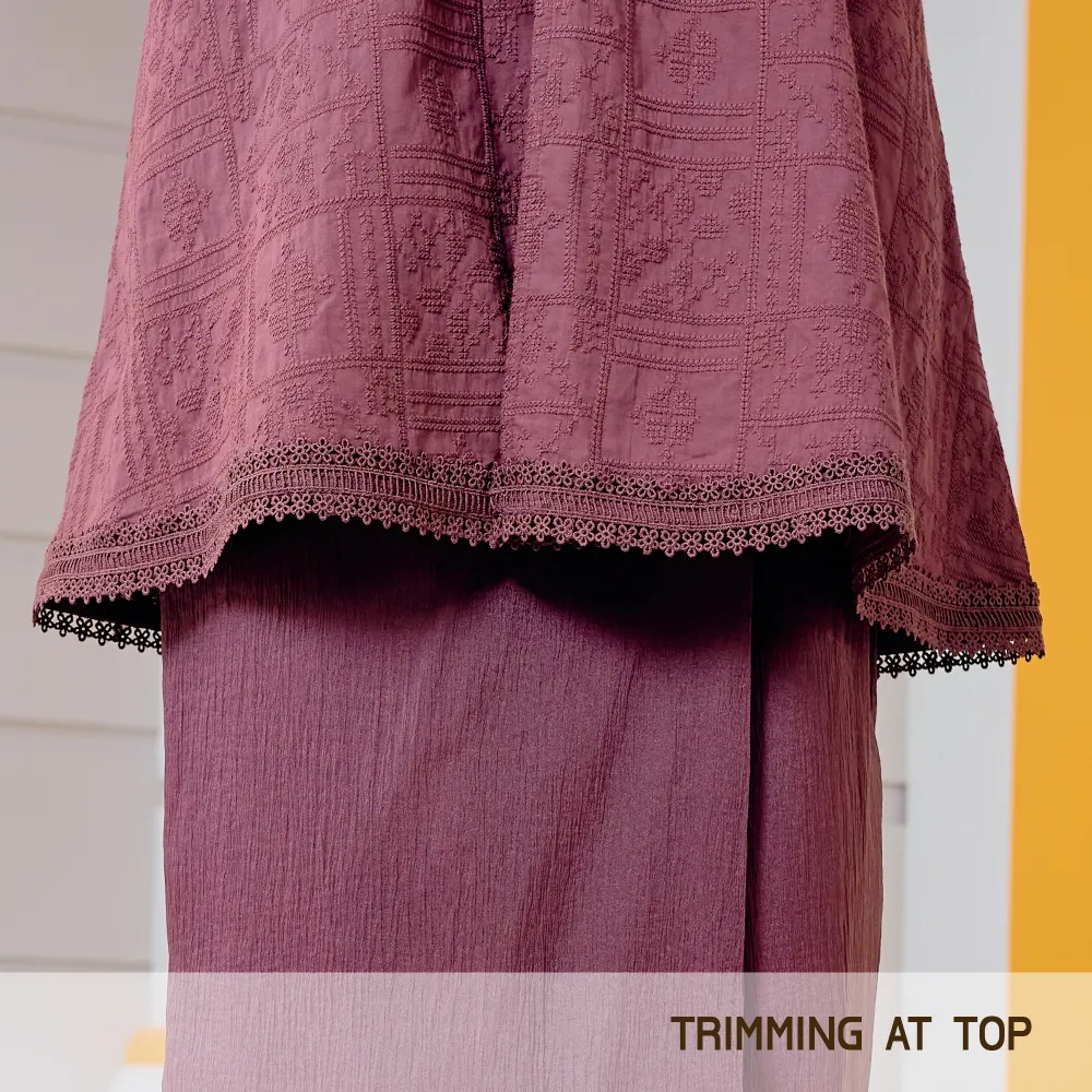 Artisanal Trimming: Detailed trimming accents across the bodice and sleeves for added texture.
