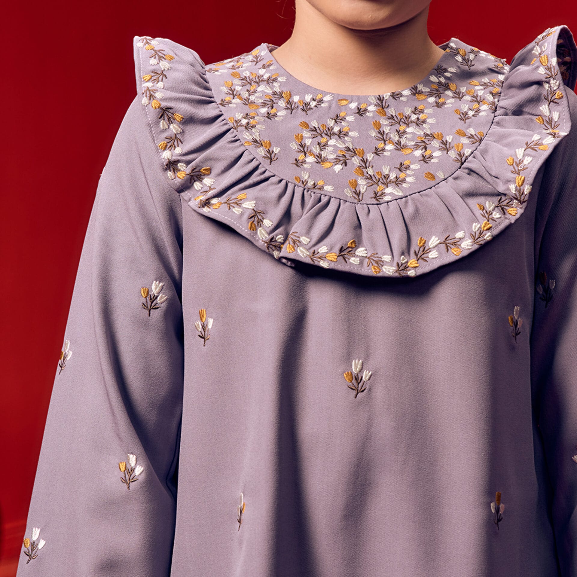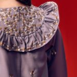 Collar: Heavy flower embroidery at the collar with gathers, adding a cute yet refined detail.