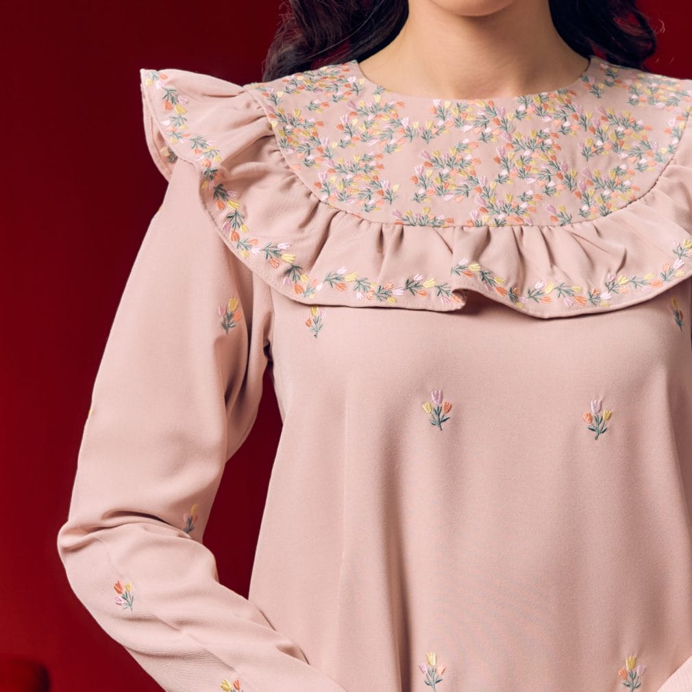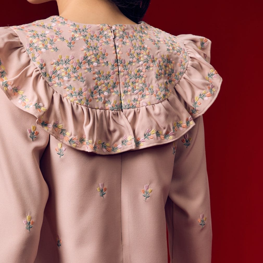 Collar: Heavy flower embroidery at the collar, enhanced with delicate gathers for a sophisticated touch.